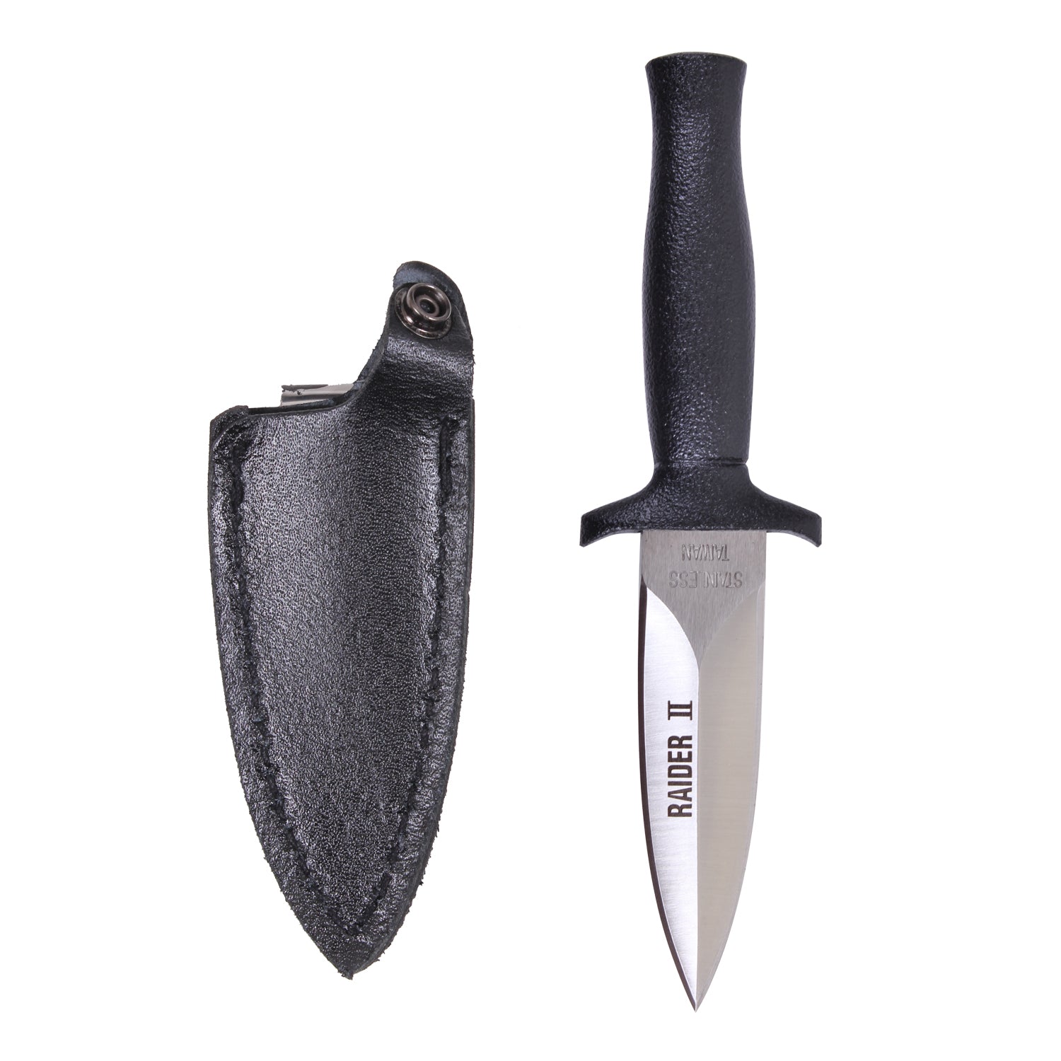 Black Raider II Boot Knife features a 3inch durable stainless steel blade and measures 6 1/2' overall, designed in classic dagger style. The Boot Knife includes a leather sheath with clip and snap closure and can be attached to your boot, clipped to your belt, pocket or backpack.