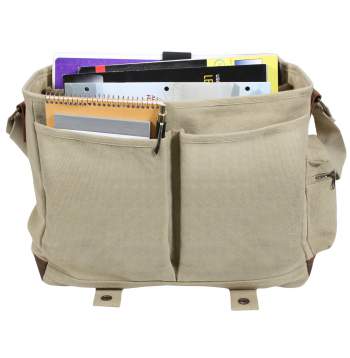 Vintage Canvas Pathfinder Laptop Bag features a heavyweight washed canvas, front and back zippered pockets, 2 side pockets w/ hook and loop closures, 2 side zippered pockets, a large main compartment with inside zippered pouch and padded sleeve with strap for laptop, brown trim bottom and accents and 2 antique brass closures.